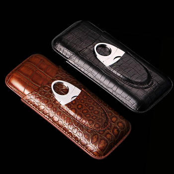 Alligator Pattern Leather Cigar Case 3 Tube Black Brown with Cutter