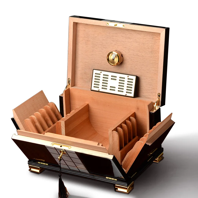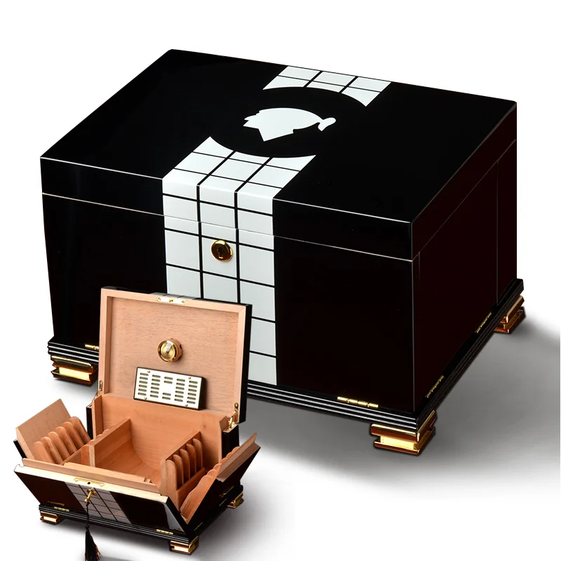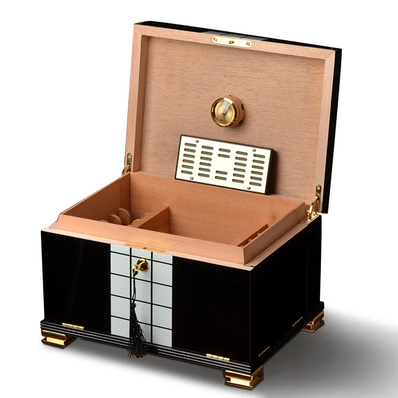 Indulge in the epitome of cigar preservation with our Import Cigar Moisturizing Box, crafted from exquisite mellow cedar wood and finished with a high-gloss piano paint. This large double cigar humidor is meticulously designed for aficionados who value both style and function. The rich aroma of cedar wood enhances the natural taste and freshness of your prized collection, whilst offering unparalleled protection.
