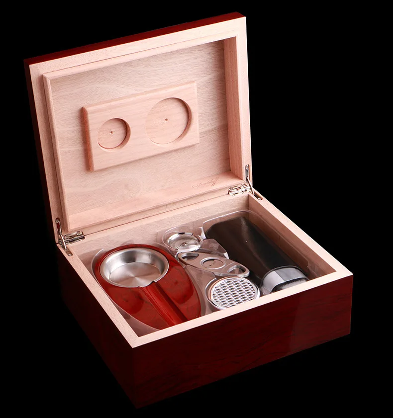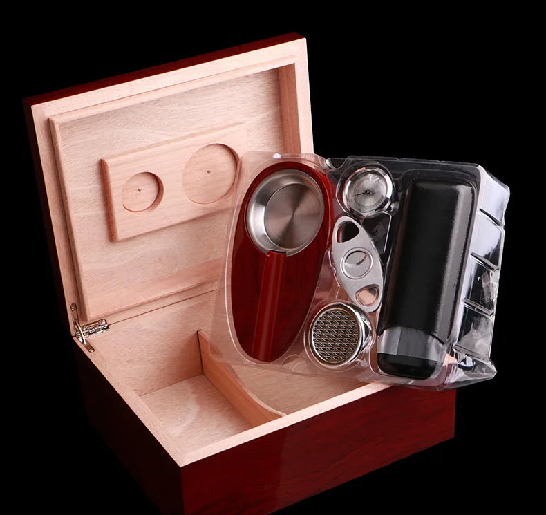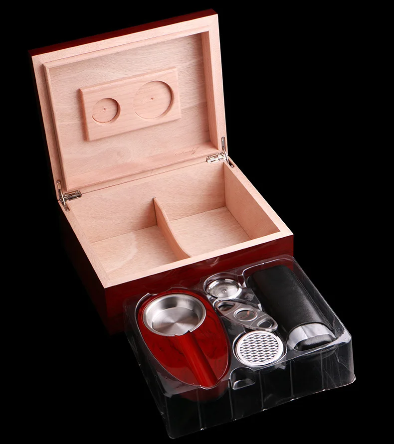 Introducing the Wooden Wine Red Cigar Humidor with Cigar Ashtray, a perfect fusion of style and practicality. Designed for cigar aficionados and those looking to impress, this humidor ensures your cigars are kept in optimal conditions while exuding a classic charm. Its rich wine red finish adds a sophisticated touch, making it a prized possession for any connoisseur.